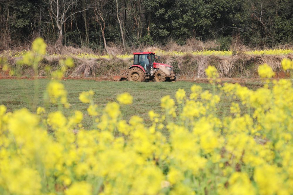 连日来,在江西省抚州市东乡区詹圩镇下马村,种粮大户正驾驶农机翻耕水田,与周围的油菜花形成一幅美丽的春耕画卷。(饶方其)