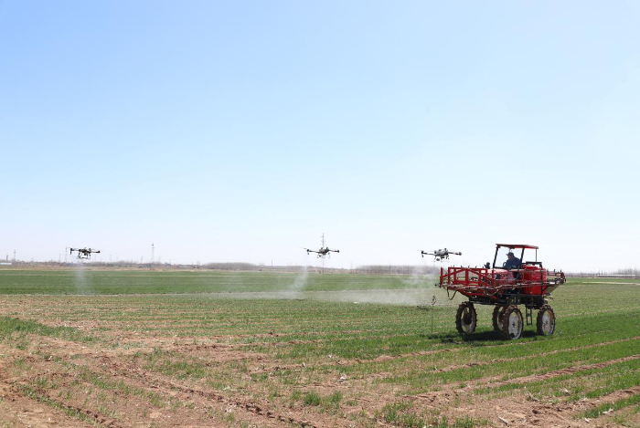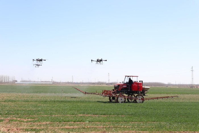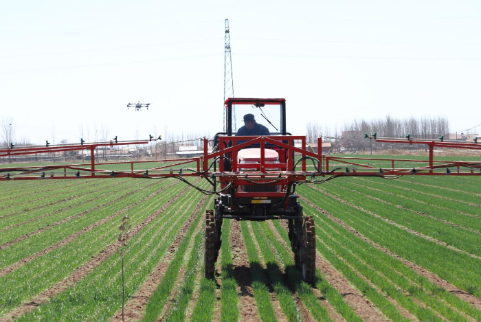 植保无人机、喷杆喷雾机正在田间进行喷药作业。
