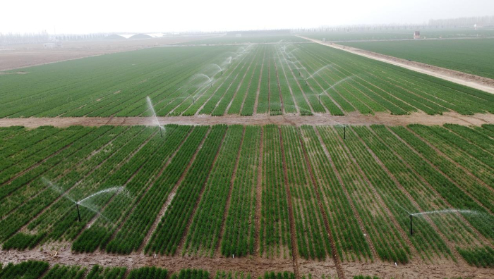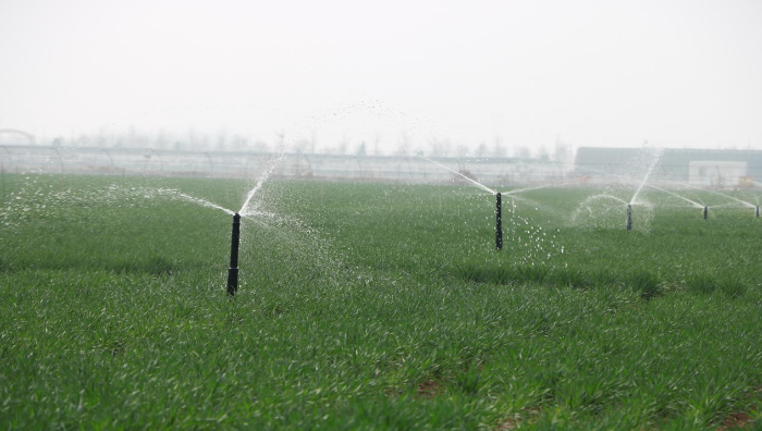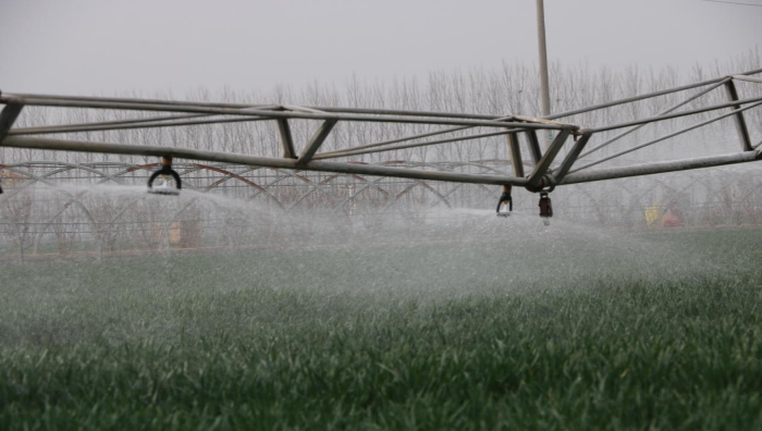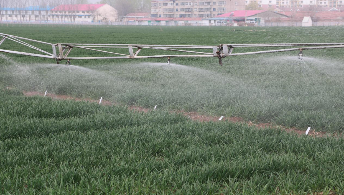 地埋式自动伸缩喷灌系统正在为麦苗浇水。喷灌技术代替了传统大水漫灌,节水、速度快、效果好。