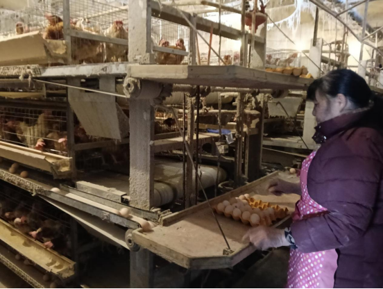 图为固始县南大桥乡大岗村适度规模养殖户罗开友的妻子正在收捡鸡蛋。(图片拍摄于2025年1月8日)