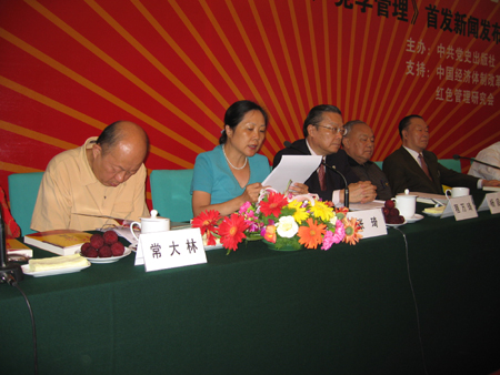 | | | | [主持人]各位领导、各位来宾、各位媒体界的朋友们、女士们、先生们:下午好!今天,我作为世界华人协会会长,能够在庄严的人民大会堂主持这次新闻发布会,我感到非常高兴!首先,我为大家介绍一下主席台就座的各位领导和嘉宾,他们是:原全国政协副主席 万国权,中共党史研究室副主任 李忠杰,中国经济体制改革研究会常务会长 杨启先,全国政协委员、原中央统战部副部长 田鹤年。 [ 2006-06-29 14:10:25 ] | | | | | | | | | [主持人]《红色管理--向中国共产党学管理》作者冯成略,中共党史出版社社长张琦,中共广东省委宣传部副部长 蒋斌,中国经济体制改革研究会咨询与项目管理中心主任邵志光,中央警卫局少将邬吉成,革命"红小鬼" 邵玉凤 、 李桂霞,企业代表石岩,莅临现场的还有来自中央电视台、北京电视台、凤凰卫视、报社、杂志社、广播电台和网站的媒体朋友们;以及其他各行业的知名人士。在此我谨代表本次会议的主办单位和支持单位中共党史出版社,中国经济体制改革研究会和红色管理研究会,向各位领导、各位来宾致以热烈的欢迎! [ 2006-06-29 14:13:08 ] | | | | | | | | | [主持人]现在,我宣布:"构建中国人自己的管理理论体系暨《红色管理--向中国共产党学管理》新书首发新闻发布会"正式开始!现在,有请本次新闻发布会主办单位领导--中共党史出版社社长张琦女士致辞。 [ 2006-06-29 14:14:38 ] | | | | | | | | | [张琦]各位领导、各位来宾:下午好!首先,我谨代表中共党史出版社和我们的合作伙伴西门文化发展有限公司,向前来出席今天会议的各位领导、各位朋友表示最热烈的欢迎。同时,向红色管理理论体系的倡导者、实践者、探索者,《红色管理》一书的作者冯成略同志致以诚挚的祝贺。 [ 2006-06-29 14:16:09 ] | | | | | | | | | [张琦]为了响应朱镕基同志“大力宣传加强企业的经营管理,大力提倡振兴中国的管理科学”、 培养“既能懂国外的经营管理,又懂中国《孙子兵法》,又懂《共产党宣言》的企业家”的号召,我社对《红色管理》一书的选题论证、文稿审核等环节作了大量细致深入的工作。特别是冯成略同志的辛勤努力,才能使这样一部管理学著作最终赶在中国共产党成立85周年前夕问世。 [ 2006-06-29 14:28:47 ] | | | | | | | | | [张琦]中国共产党85年的历史,积累了丰富的管理、政治、经济、军事、外交、文化、科技、社会,等多方面工作的经验。其中,经济工作是重要的一个方面,也是当前党的工作中最重要的一项工作。《红色管理》一书从管理科学这一全新的角度,认真回顾了中国共产党80多年历史中,特别是执政50多年历史中领导经济工作的实践,以科学发展观系统地将党在纲领、路线、组织、干部、领导、控制、创新等方面的成功经验加以管理学的归纳和提炼,构建了一个全新的党史研究体系,也是管理学上一次有意义的尝试与创新。书中概括了中国共产党管理经济的智慧与经验,对现阶段我国的社会主义现代化建设、中国企业的发展振兴有借鉴价值。 [ 2006-06-29 14:32:53 ] | | | | | | | | | [张琦]胡锦涛同志在出席全国政协九届五次会议,同社会科学界和新闻出版界委员共商国事时指出,人类文明的发展史告诉我们,一个民族要兴旺发达,要屹立于世界民族之林,不能没有创新的理论思维。尤其是当今世界发展变化很快。我们要顺应时代发展的潮流,跟上时代前进的步伐,更需要大力推进理论创新……努力拿出更多有深度、有份量、有说服力的思想理论成果,更好地为党和政府决策服务,为改革开放和现代化建设实践服务。 [ 2006-06-29 14:38:16 ] | | | | | | | | | [张琦]而红色管理理论体系正是理论创新的产物,它是在汲取中国共产党以往成功实践经验的基础上,注重与中国现阶段国情紧密结合,把握中华民族伟大复兴的发展趋势,以管理学的辩证思维,深入研究和回答了现实生活实际问题,并提出了许多新颖独特的创新观点,这是对我国管理思想体系的完善与补充。 [ 2006-06-29 14:39:37 ] | | | | | | | | | [张琦]红色管理理论在字里行间都洋溢着科学发展观的思维,因此具有强大的生命力和鲜活力。我们有理由相信,随着《红色管理》一书的发行与推广,中国共产党先进思想的传播与普及,必将使中国广大人民得到深远的文化洗礼,推动经济社会全面、协调、可持续发展,实现社会主义物质文明、政治文明和精神文明的共同进步。 [ 2006-06-29 14:41:03 ] | | | | | | | | | [张琦]尽管本书还存在着许多不足之处,但仍可以处处看到,在字里行间洋溢着由科学发展观的思维表现出的新鲜活力,我们有理由相信,随着红色管理一书和更多同类书的发行与推广,中国共产党先进管理的思想将得到广泛的传播和普及。推动经济社会全面协调可持续地发展,实现社会主义物质文明、政治文明和精神文明共同进步。中共党史出版社直属于中共中央党史研究室,是一家具有鲜明特色和较高知名度的专业出版机构,成立于1983年2月。 [ 2006-06-29 14:45:43 ] | | | | | | | | | [张琦]我们办社的宗旨是为党史、革命史研究、教学宣传服务,为党的建设和干部队伍建设服务,为社会主义精神文明建设服务。作为中央级社科类专业出版社,肩负着以史建今,资政育人的历史责任和使命。中共党史出版社倡导与时俱进,严谨求实,稳步前进的工作作风,以精品书、权威书、品牌书为市场定位,注重科学性、权威性和可读性,逐步形成了