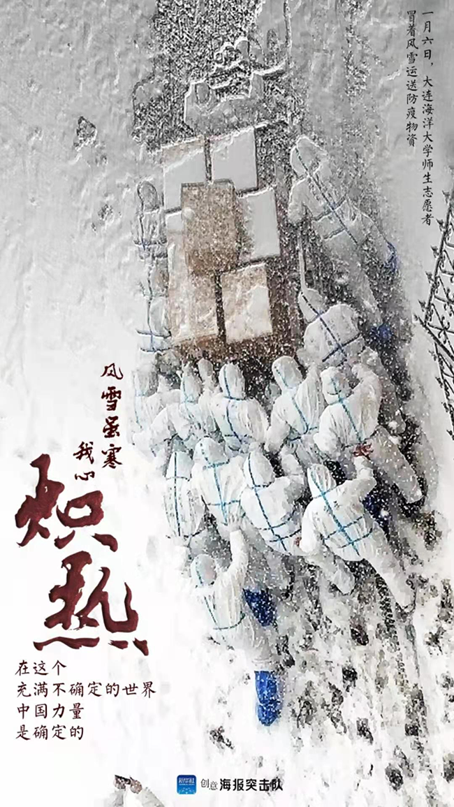 这几天,一组“移动的雕塑”感动了无数人。大连海洋大学师生志愿者冒雪运送物资,风雪中的画面,传递出浓浓的温暖、坚强的力量,风雨同舟、患难与共的精神激荡人心。网友们纷纷留言,“最冷的天,最暖的背影”“自豪生在中国”“中国的背后是满满的凝聚力”……