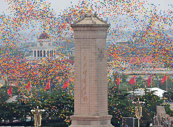 7月1日上午,庆祝中国共产党成立100周年大会在北京天安门广场隆重举行。这是庆祝大会现场放飞气球。新华社记者 李响 摄
