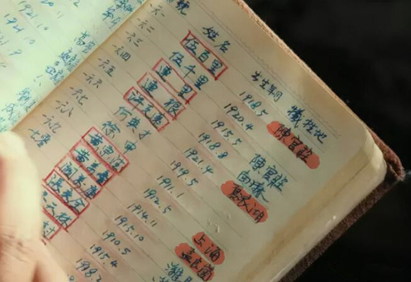 已经在战场牺牲的人,他会用红色笔画上一个圈,比如他的哥哥伍百里;新加入的战士,则记下他们的编号和名字,比如他的弟弟伍万里。