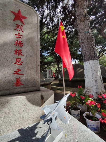 烈士杨根思的墓前,除了鲜花之外,还摆放着一架“歼-15”战斗机模型和几张“歼-20”战斗机的照片。