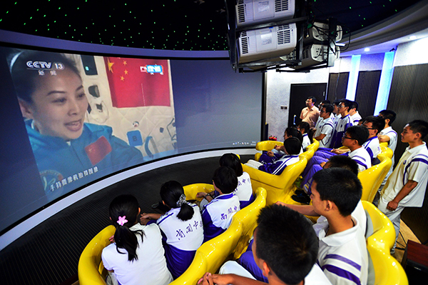 图为2013年6月20日,在南开中学航天体验馆,学生们通过弧形屏幕观看中国首次太空授课。