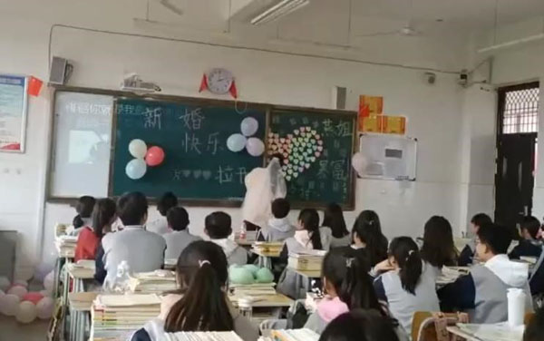 为了感谢老师的辛苦付出,学生们在老师结婚当天,亲手为她戴上婚纱,用便利贴在黑板上粘贴出心形,并写满了祝福的话;