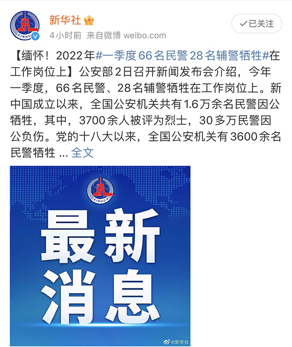 公安部2日召开新闻发布会介绍,今年一季度66名民警、28名辅警,牺牲在工作岗位上。