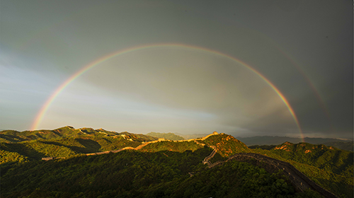 大雨过后,多地出现彩虹,上图是新华社6月14日播发的,雷阵雨过后,位于河北省承德市滦平县的金山岭长城出现双彩虹景观。