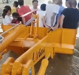 在湖北襄阳,路面积水,行人车辆无法前行,一男子见状开来铲车,载着上班的市民送至路对面,解决了大家的燃眉之急。