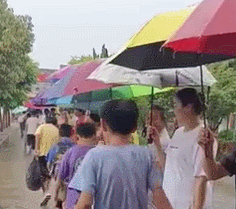 在大连庄河市,大雨倾盆而下,考生即将进入考场,民警、老师、考点工作人员自发撑起了30米长的“斜式伞桥”。“桥”的一端连着送考校车,另一端连着考点教学楼大门;雨伞齐刷刷地向考生倾斜,撑伞者的后背却“泡”在了雨水里。有网友留言说,“这是爱在‘伞伞’发光!”