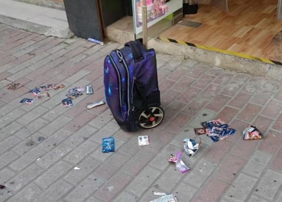 图为上海某小学周边小卖部门口,学生拆卡后将低价值卡牌随地遗弃。新华网发(王若宇 摄)