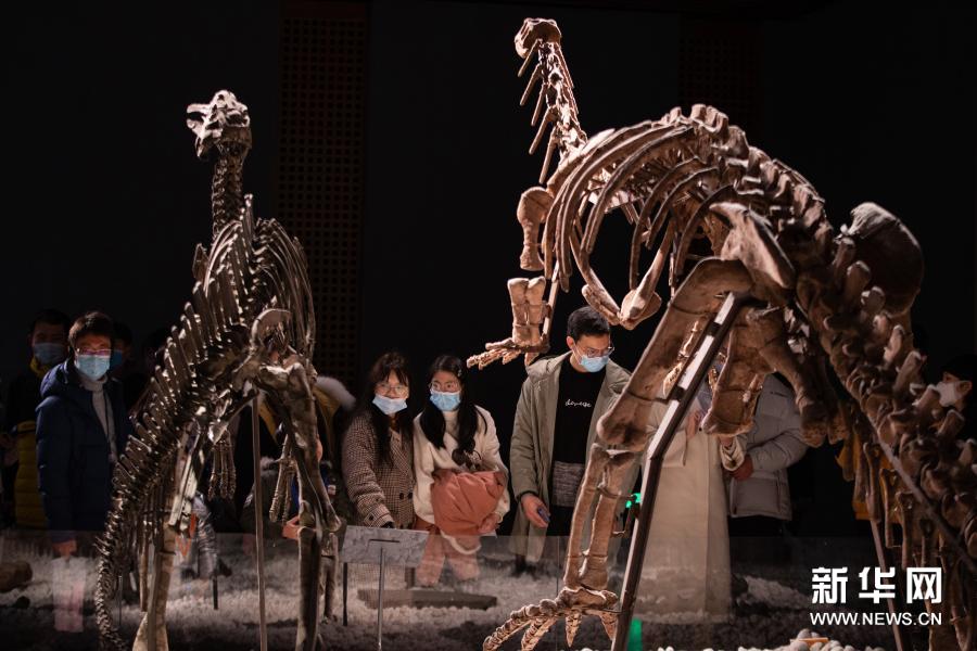 2021年1月2日,观众在南京博物院观看展出的恐龙化石。新华社发(苏阳 摄)