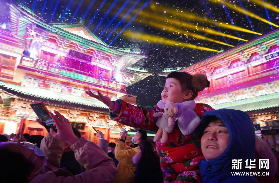 观众在观看《寻梦滕王阁》大型实景演出(2021年1月1日摄)。新华社记者 万象 摄