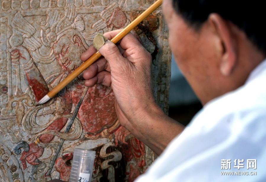 工作人员在对石棺床的彩绘进行加固(2020年12月24日摄)。新华社记者 李安 摄
