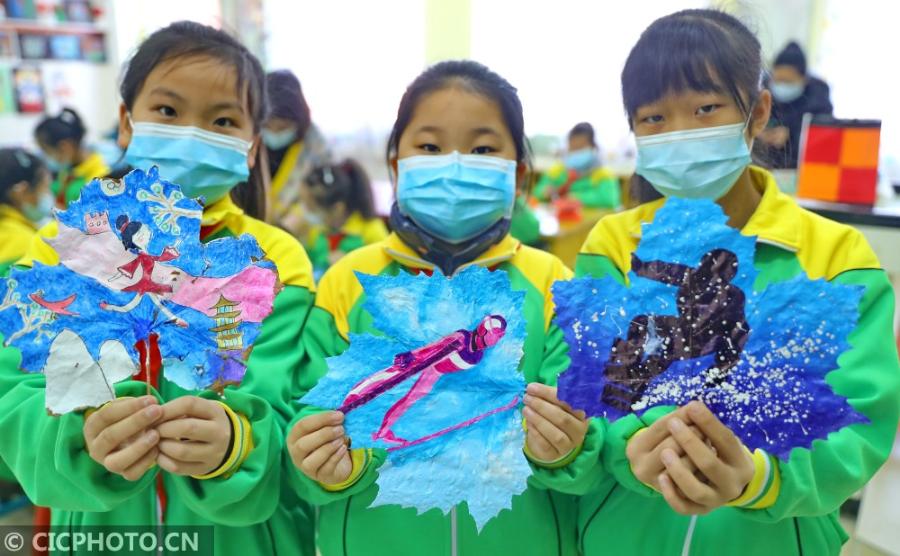2021年1月4日,河北省秦皇岛市海港区杜庄学区第一小学的学生在展示制作的冬奥主题树叶彩绘作品。