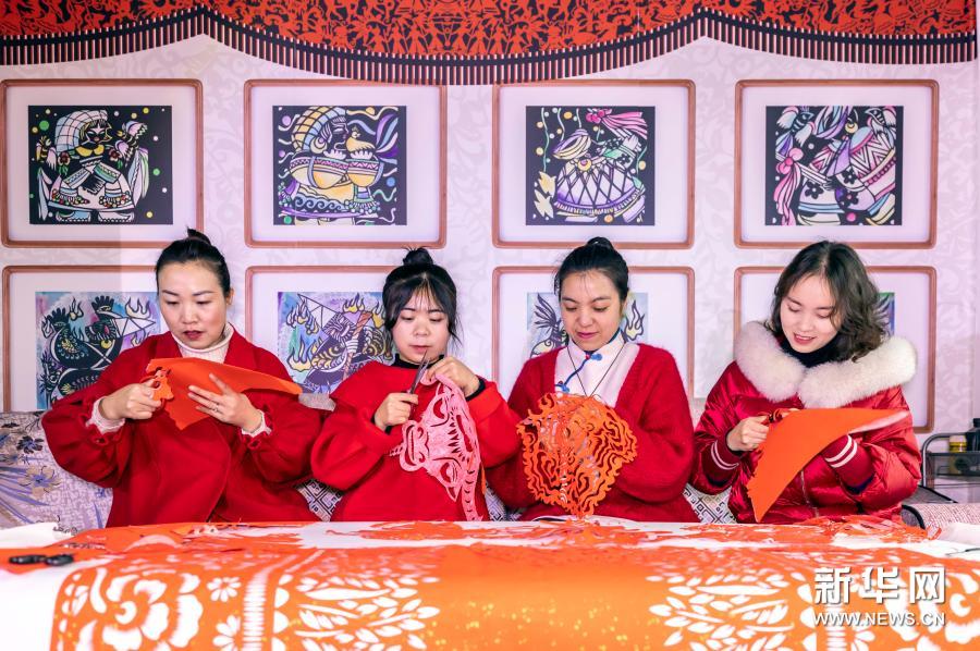 1月17日,岳红霞(右二)带领工作室学员创作“金牛送福”剪纸。近日,曾获全国剪纸大赛“金剪刀奖”、贵州省毕节市黔西县非遗传承人岳红霞带领工作室学员创作“金牛送福”系列主题作品,迎接农历牛年。新华社发(范晖 摄)
