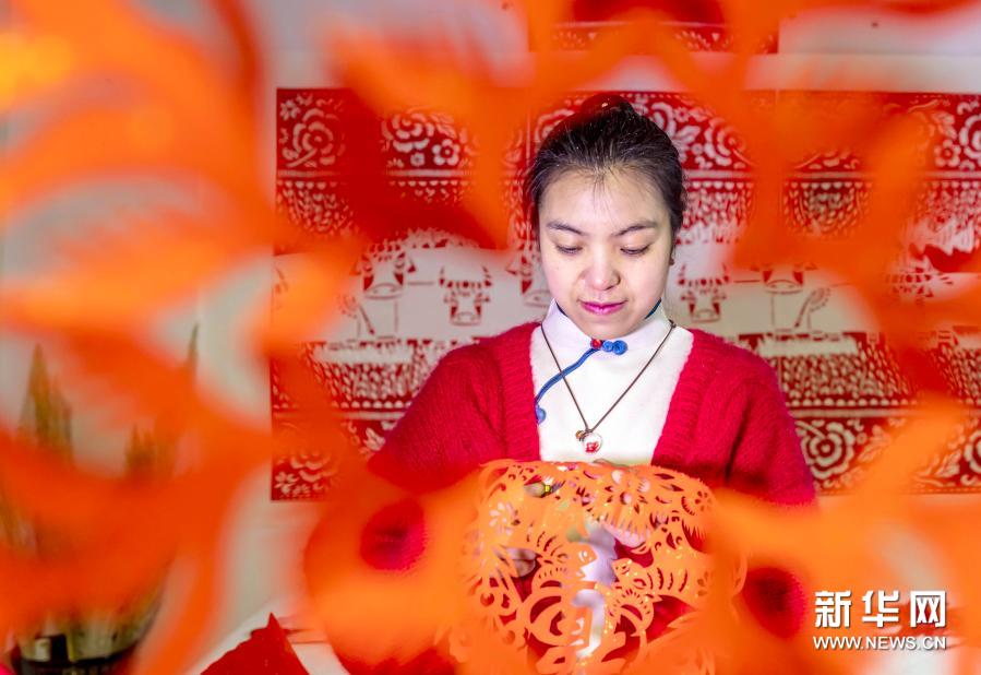 1月17日,岳红霞在工作室创作“金牛送福”剪纸。新华社发(范晖 摄)