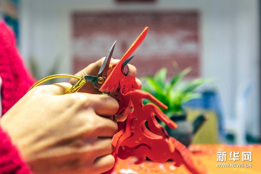 1月17日,岳红霞在工作室创作“金牛送福”剪纸。新华社发(范晖 摄)