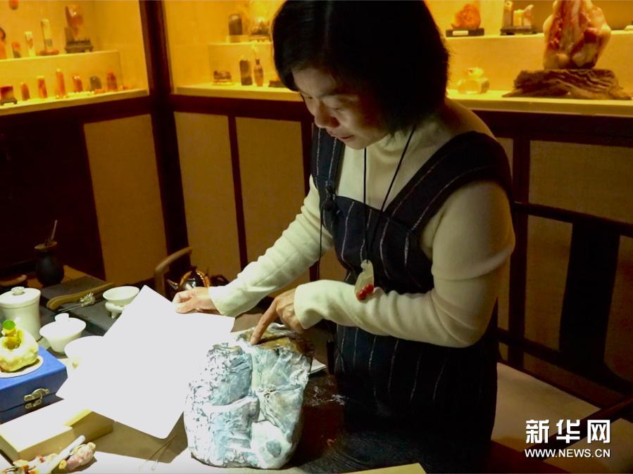 寿山石雕刻师叶子介绍自己对一块石料的设计构思(2020年12月10日摄)。新华社记者 褚萌萌 摄