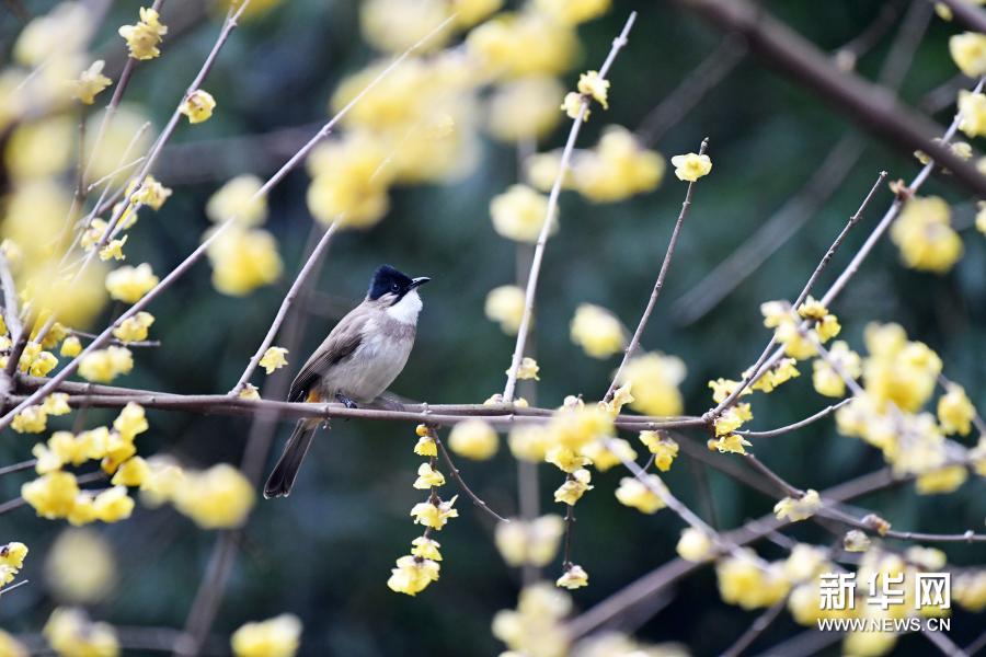 1月20日,小鸟在贵州省仁怀市街头的腊梅枝头停歇。当日是“大寒”节气。新华社发(陈勇 摄)