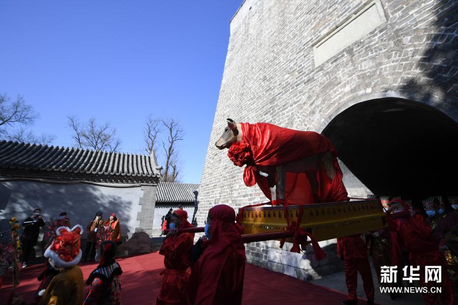 2月2日,礼仪官抬着“春牛”进入古观象台。新华社记者 鞠焕宗 摄