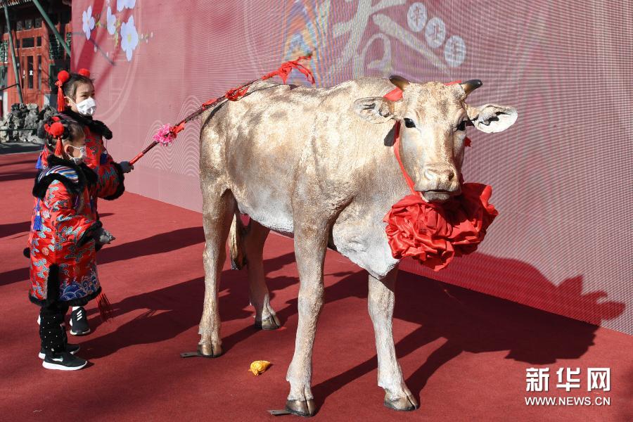 2月2日,打扮成“春姑娘”的小朋友在“鞭打春牛”。新华社记者 鞠焕宗 摄