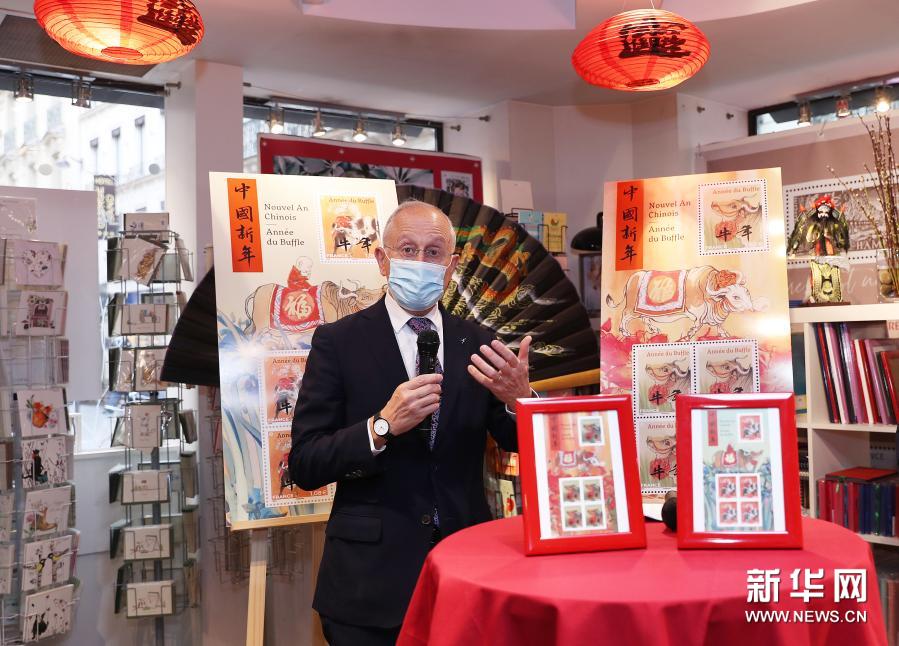 2月6日,法国邮政公司首席执行官菲利普·瓦尔在法国巴黎举行的牛年生肖纪念邮票发行仪式上讲话。新华社记者 高静 摄