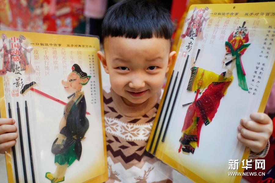 2月8日,一名小朋友在迁安市“非遗年味市集”上展示刚刚购买的皮影。新华社发