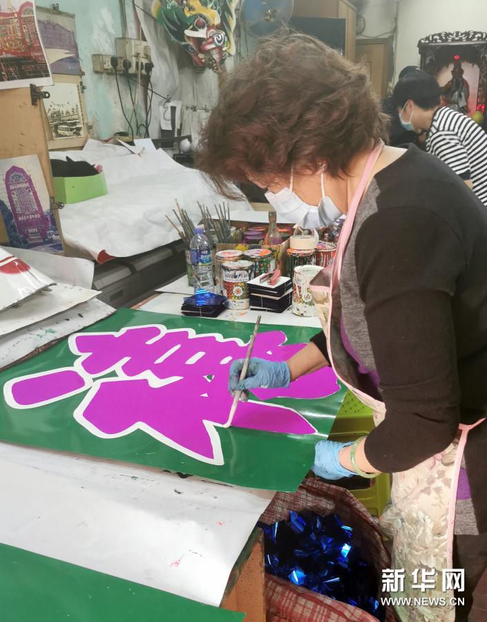 李翠兰给一个一尺半见方、亮紫色的“禧”字描上白边(1月25日摄)。新华社记者 陆敏 摄