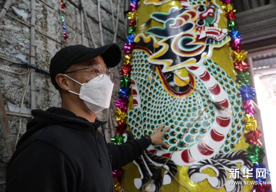 花牌师傅黎俊霖介绍“飞龙在天”龙柱(1月25日摄)。新华社记者 李钢 摄