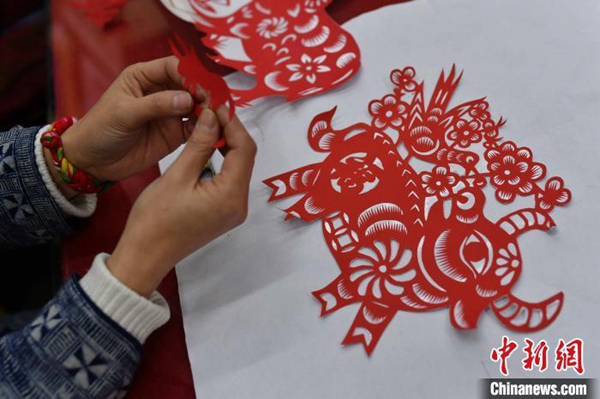 资料图:民间剪纸艺人正在创作牛年生肖剪纸 王海滨 摄