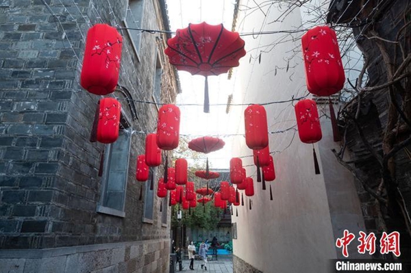 资料图:随着农历牛年将至,南京街头张灯结彩,各种造型的花灯彩灯齐亮相,喜气洋洋迎新春。大红灯笼高高挂起来。泱波 摄