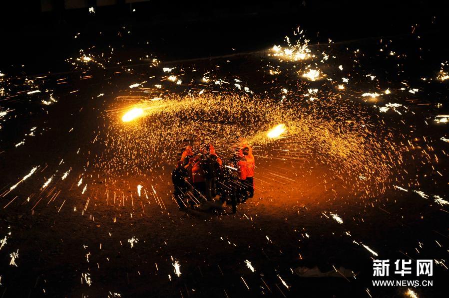 2月19日晚,滦平县民间艺人在表演“抡花”。新华社发(王立群 摄)