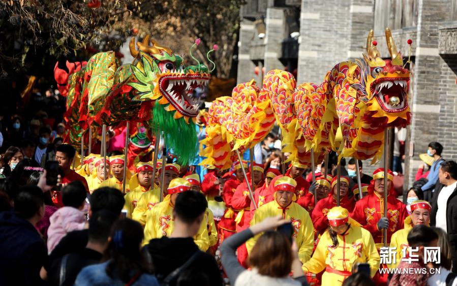 2月21日,游客在台儿庄古城观看社火巡游表演。元宵节将至,在山东省枣庄市台儿庄古城,丰富多彩的活动轮番上演,游客近距离感受传统民俗的魅力,欢欢喜喜迎佳节。新华社发(孙中喆 摄)