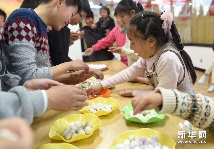 2月21日,枫源村的小朋友在村文化礼堂搓汤圆。新华社记者 韩传号 摄