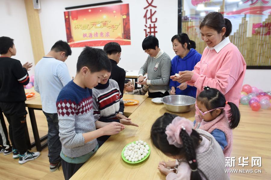 2月21日,枫源村文化礼堂志愿者和村里的小朋友一起搓汤圆。新华社记者 韩传号 摄