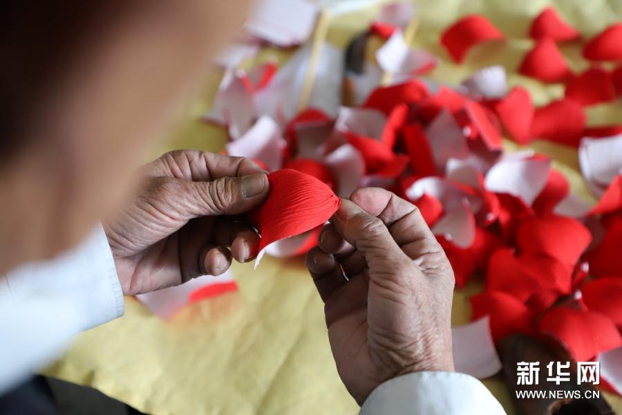 2月24日,山东省滨州市惠民县淄角镇土户王村民间艺人王相华在制作莲花灯。新华社发(初宝瑞 摄)