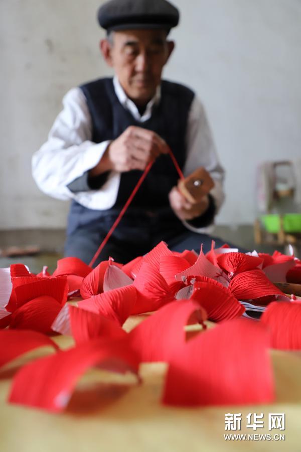 2月24日,山东省滨州市惠民县淄角镇土户王村民间艺人王相华在制作莲花灯。新华社发(初宝瑞 摄)