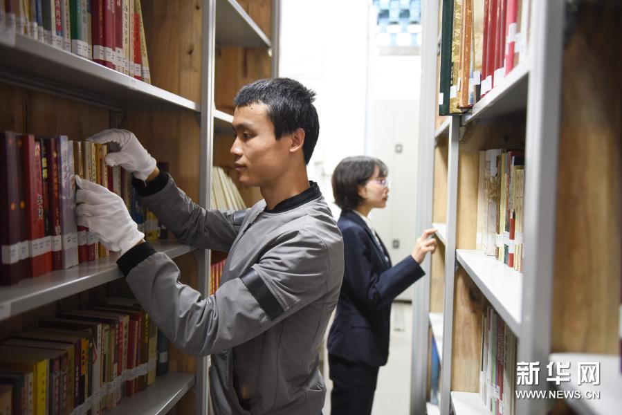 2月24日,四渡赤水纪念馆陈列室的工作人员梁华、黄真(左)在库房内清点藏书。新华社记者 刘续 摄