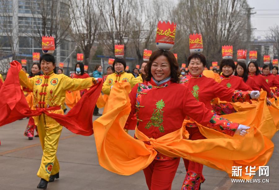 2月24日,村民们在街头表演顶灯。新华社记者 马毅敏 摄