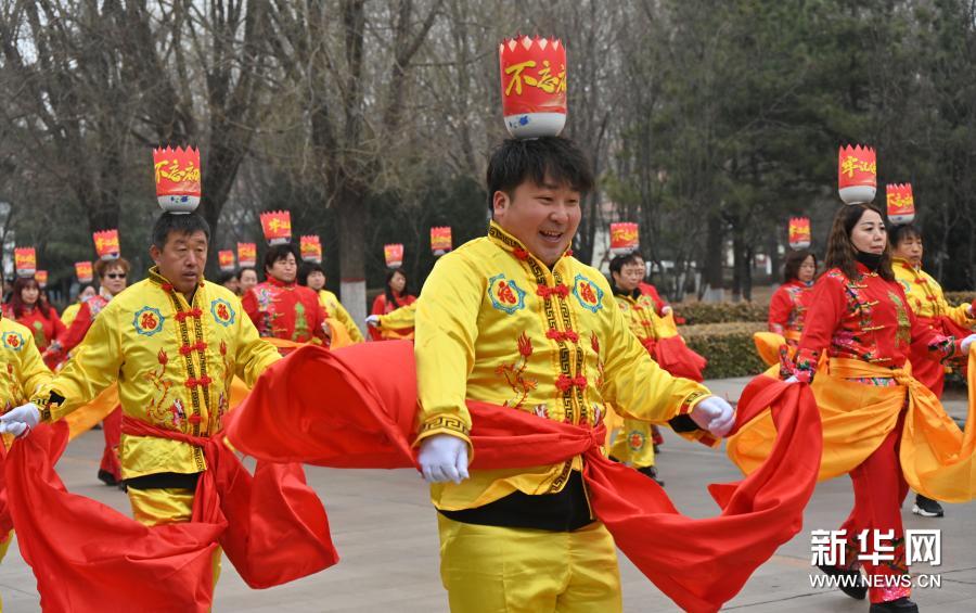 2月24日,村民们在街头表演顶灯。新华社记者 马毅敏 摄