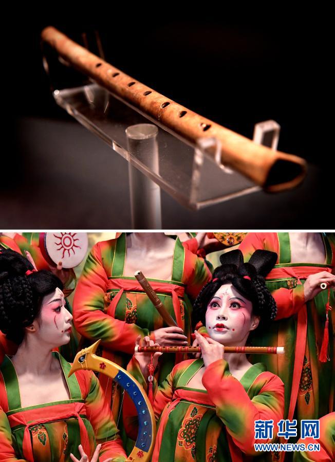 拼版照片:上图为河南博物院展出的“贾湖骨笛”(2019年11月18日摄);下图为郑州歌舞剧院的演员在河南博物院录制元宵奇妙夜节目(2月20日摄)。新华社记者 李安 摄