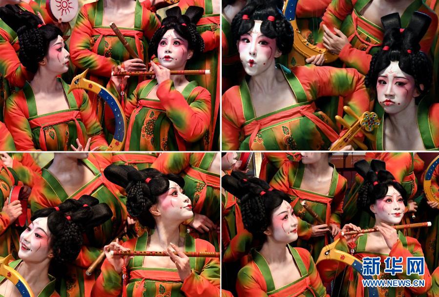 郑州歌舞剧院的演员在河南博物院录制元宵奇妙夜节目(拼版照片,2月20日摄)。新华社记者 李安 摄
