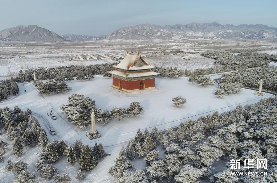 3月1日拍摄的清东陵景区主神路大碑楼雪景(无人机照片)。新华社发