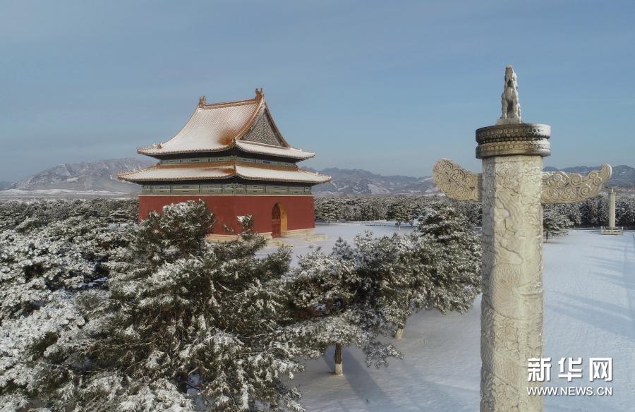 3月1日拍摄的清东陵景区主神路大碑楼雪景(无人机照片)。新华社发