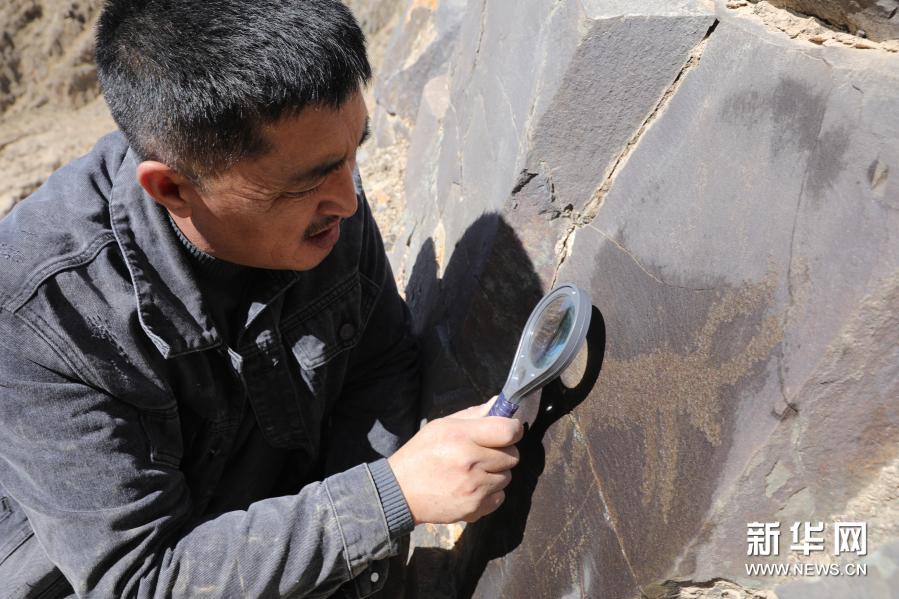 3月22日,杜成峰在甘肃省张掖市肃南裕固族自治县榆木山观察一处岩画。新华社记者 杜哲宇 摄