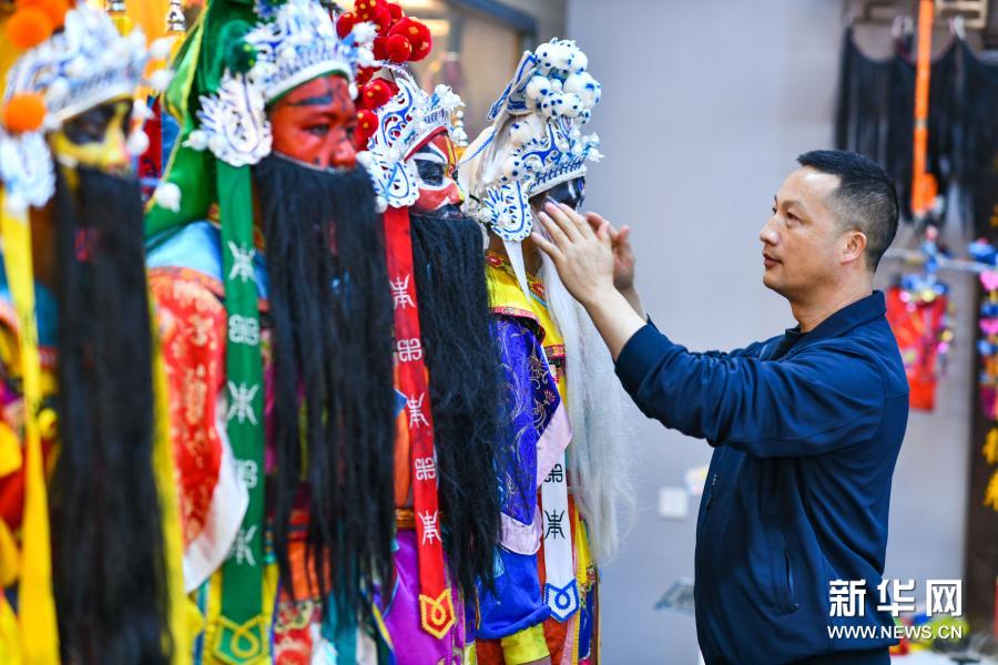 3月23日,贵州省龙里县第三中学龙里太平花灯戏指导老师刘江(右一)给学生整理道具。新华社记者 杨文斌 摄
