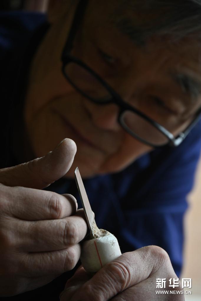 3月24日,赵同泽在工作室里检查刻刀。新华社记者 马毅敏 摄