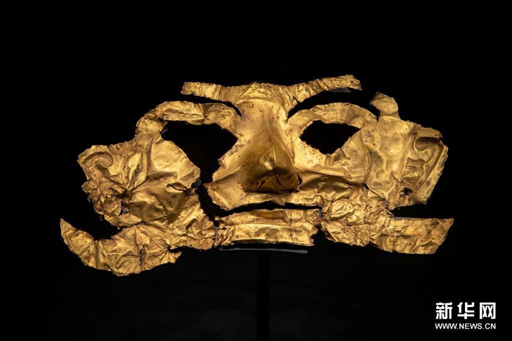 这是在位于四川省广汉市的三星堆博物馆拍摄的1986年出土于三星堆1号“祭祀坑”的金面罩(3月17日摄)。该金面罩系用金皮锤拓而成,其形制与金面铜人头像上的金面罩形同。新华社记者 沈伯韩 摄